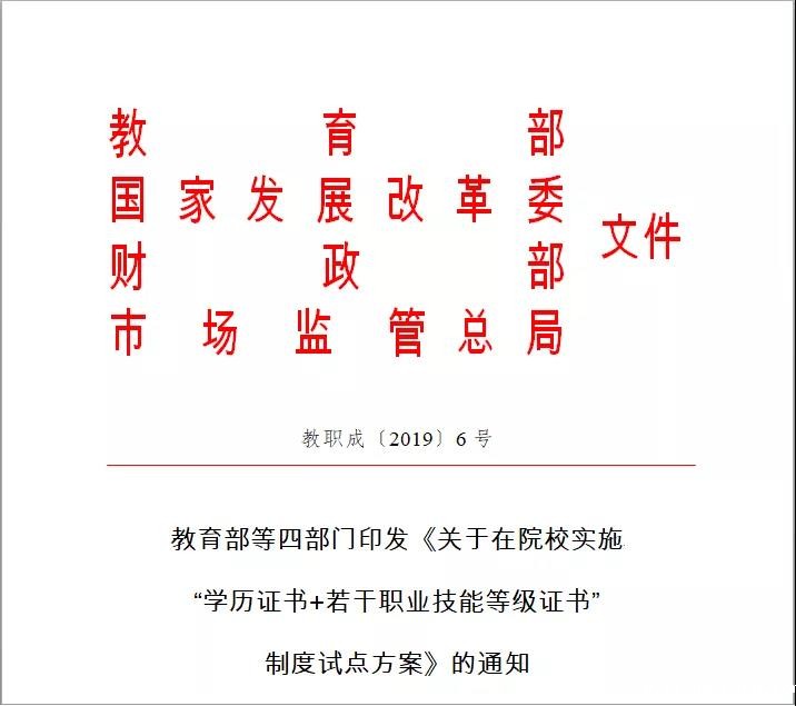 为深入贯彻党的十九大精神,按照全国教育大会部署和落实《国家职业教育改革实施方案》(简称“职教20条”)要求,教育部会同国家发展改革委、财政部、市场监管总局制定了《关于在院校实施“学历证书+若干职业技能等级证书”制度试点方案》(以下简称《方案》),启动“学历证书+若干职业技能等级证书”(简称1+X证书)制度试点工作。现将《方案》印发给你们,请结合本地区、本部门实际情况组织实施。