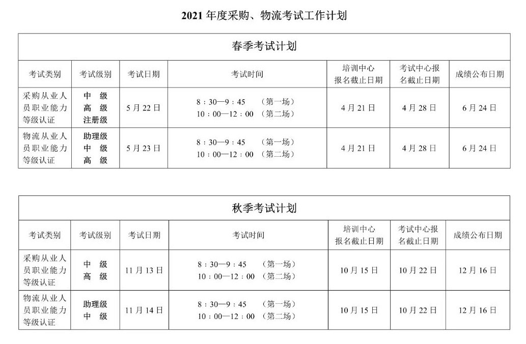 2021年度采购、物流春季考试将于5月22—23日进行;秋季考试时间为11月13—14日。ITC春、秋两季中文考试(机考)时间定于5月、11月举行,具体日期另行通知。现将春、秋两季物流及采购考试时间、报名截止日期及成绩发布日期公布如下,请各地区培训中心、考试中心严格按照要求做好考前报名工作。
