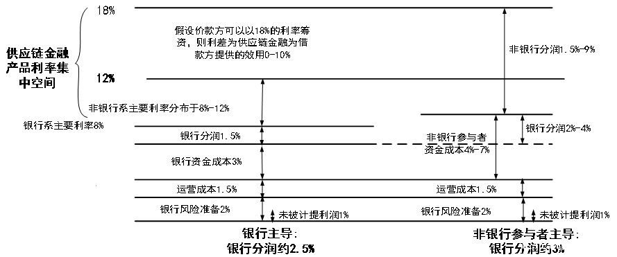 当供应链金融产品由银行提供时,利率在8%左右,银行分润为2.5%。而当供应链金融产品由银行以外的参与者提供时,利率在8%-12%之间浮动,最高可达18%;此时,风险测评者为非银行金融机构,分润可达2.5%-10%,如果其能以较低的资金成本筹资,则可进一步扩大利润。在非银行参与者主导供应链金融的模式下,银行与风险测评者合作,平均分润能提高至3%,高于自身直接开展供应链金融业务,从而使得资金方和主导方共赢,推动行业合作加深。
