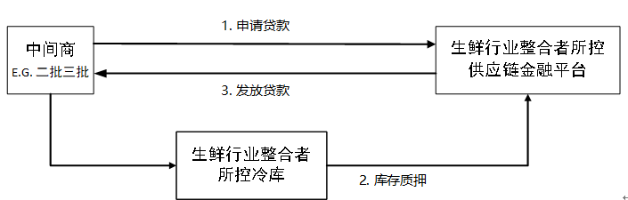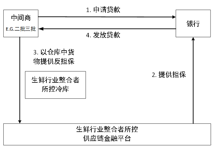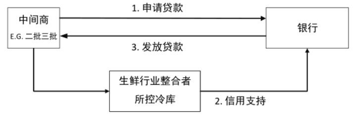 生鲜行业整合者基于所控制的冷链仓库,可配合银行,为在其冷库中存放肉类冻品的生鲜行业中间商提供存货融资服务。