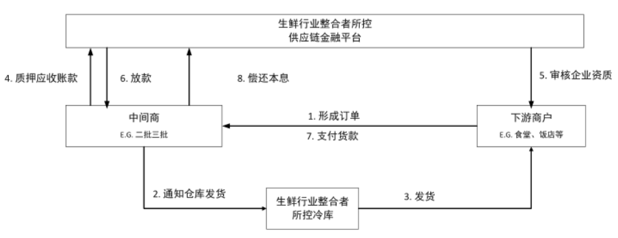 通过冷链物流信息,生鲜行业整合者可以获知中间商的下游买方的信息,其中部分下游买方为偿付能力有保障且资信状况良好的企业,例如连锁饭店、国企和事业单位食堂等。这些中间商的下游优质买方往往采购量稳定且成规模,因此能够获得中间商的一定账期。对于由此产生的中间商持有的对这些企业的应收账款,生鲜行业整合者的供应链金融平台也可为其提供应收账款融资业务。