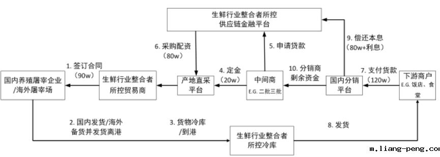 生鲜产业整合者的供应链金融服务将在线上完成,配合产地直采平台和国内分销平台,实现资金流的闭环。