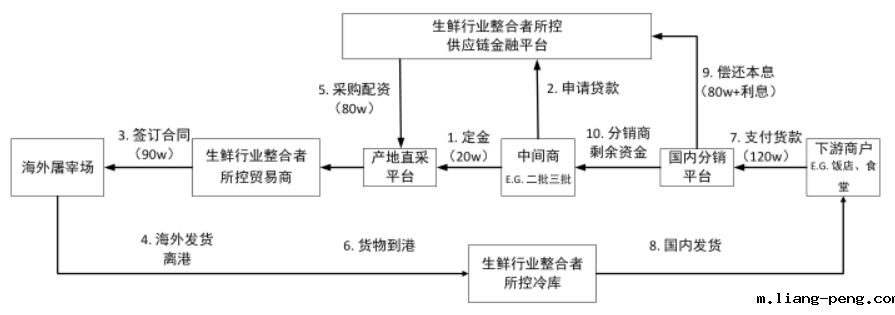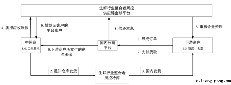 通过国内分销平台的线上交易数据,生鲜行业整合者可以比线下应收账款融资业务场景更方便地获知中间商与下游买方的交易记录,对于优质下游买方,国内分销平台可提供一定时段内的赊销场景,且供应链金融平台可以对中间商持有的应收账款提供应收账款融资服务。