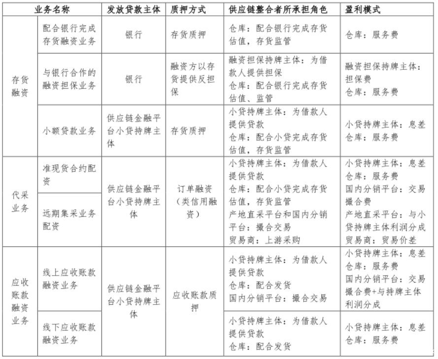 供应链金融平台下小额贷款持牌主体获取息差收益,计息期间为货物离港起,直到货物全部卖出、货款全部收回;产地直采平台可与小额贷款持牌主体进行息差收益分成;国内分销平台获取交易手续费,且在流量充足时可获取广告费等其他商业模式获取费用;仓库收取仓储服务费和其他增值服务费;贸易平台赚取贸易价差。
