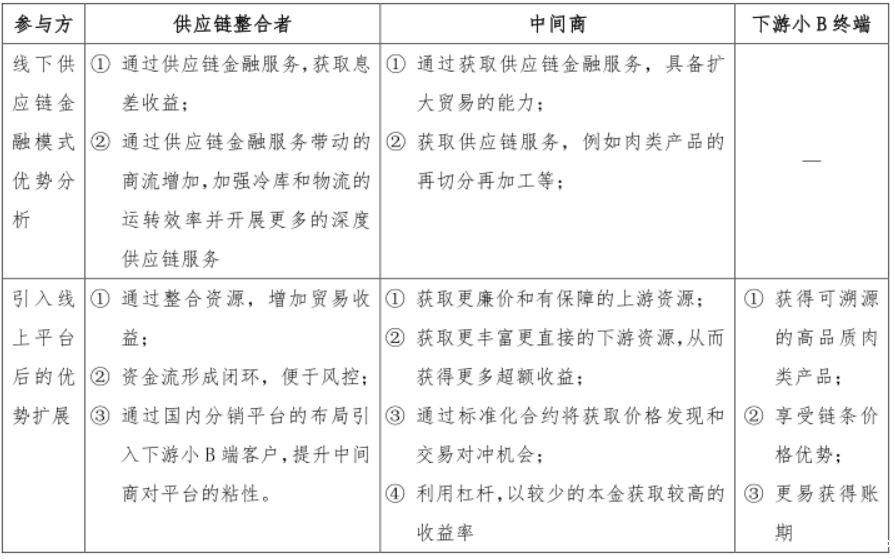 在线上供应链平台搭建后,生鲜行业整合者将能够打通供应链上中下游,通过供应链金融服务带动贸易,且形成资金流闭环和增加收益;而中间商和下游小B终端也将通过参与到线上交易平台而获得收益。由此,供应链平台参与各方将形成“三赢”局面。