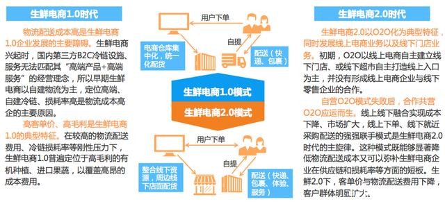 报告认为,中国生鲜电商的业务模式正在由重资产模式向O2O过渡。从生鲜电商的商业模式来看,可分为线上布局为主、重资产自建物流模式的生鲜电商1.0,以及O2O模式下的生鲜电商2.0,两者主要的区别在于物流模式的不同。