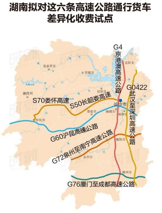 湖南省一是对G72湖南段垄茶路段、G76湖南段汝郴和郴宁路段通行的货车,计重收费的基本费率从现行的0.09元/吨·公里调降至0.08元/吨·公里;二是对试点路段通行的10吨以上货车,计重收费的计算方式由原来没有实行分档计费(即按基本费率从0吨开始线性递减计费),调整为实行分档计费(即按基本费率从10吨开始线性递减计费)。