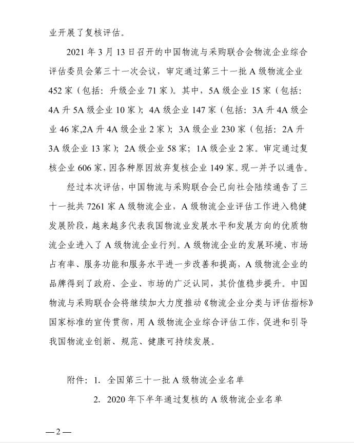 中国兵工物资集团有限公司、包头华通物流(集团)有限公司、上海万创危险品物流有限公司、秦皇岛中首物流有限公司、山西太铁联合物流有限公司、山西晋港物流集团有限公司、沈阳煤业(集团)国源物流有限责任公司、吉林省东泰建筑材料钢材批发大市场有限公司、南京今维宁投资发展有限公司、江苏白杨湾物流中心有限公司、苏州恒莱国际货运有限公司、中国石油天然气运输公司华东燃气运输分公司、江苏融达再生资源加工配送有限公司、安徽光太实业集团有限公司、安徽春天物流有限公司、合肥永春物流有限责任公司、福建省中舡物流有限公司、吉安市综合物流中心有限公司、庆云北方通达物流有限公司、得利斯集团(诸城)贸易物流有限公司、山东盛运物流有限公司、山东沂蒙优质农产品交易中心有限公司、淄博保税物流有限公司、河南天天金程物流有限公司、荆州市鑫泰达物流有限公司、武汉铁路襄阳金利物流有限公司、湖北襄阳国家粮食储备库、中海海南物流有限公司、洋浦隆鑫船务有限公司、海南海峡航运股份有限公司、四川眉山顺达汽车运输有限责任公司、云南鑫盛物流有限公司、云南天一仓储配送有限公司、甘肃国储物流有限责任公司、宁夏交通国际物流港、必胜(上海)食品有限公司、上海百联石化物流有限公司、中新通现代物流有限公司、重庆大江工业集团兴辰物流有限责任公司、山西金海升物流有限公司、沈阳京东世纪贸易有限公司、沈阳中外运久凌物流发展有限公司、吉林省顺风物流有限公司、长春市凯旋物流有限责任公司、长春市鑫驿物流有限公司、昆山华东国际物流服务有限公司、大正信(张家港)物流有限公司、南通庆堂春医药有限公司、江苏省新世纪盐化集团化工物流有限公司、南通中友食品有限公司、中央储备粮如东直属库、如东县新光棉花实业有限责任公司、南通顺港仓储有限公司、嘉里物流(昆山)有限公司、江苏省邮政速递物流有限公司昆山市分公司、张家港保税区沿江仓储有限公司、淮安市华强运输有限公司、徐州丰义物流有限公司、浙江万国国际货运代理有限公司、浙江鲲鹏国际货运代理有限公司、浙江欧裕龙物流有限公司、浙江中外运有限公司金华分公司、浙江康宏物流股份有限公司、衢州市广富物流有限公司、浙江义乌升中国际货运代理有限公司、浙江定远国际货运代理有限公司、义乌市荣庆国际货运代理有限公司、义乌宝通国际货运代理有限公司、义乌天旭国际货运代理有限公司、义乌市泰佳国际货运代理有限公司、义乌荣航国际货运代理有限公司、义乌佳途国际货运代理有限公司、义乌市旭航国际货运代理有限公司、义乌创发国际货运代理有限公司、浙江德迅供应链管理有限公司、杭州富阳传化物流基地有限公司、盟道供应链服务(杭州)有限公司、浙江麦斯康莱医药有限公司、宁波安迅达国际物流有限公司、浙江百富国际物流有限公司、安徽百路物流有限公司、安徽幸运国际物流股份有限公司、望江澳宝江花工贸有限公司、安徽中财物流有限公司、冠辉物流(中国)有限公司、漳州开发区鸿泰运输有限公司、福建快通物流有限公司、福建省诚丰胜通物流有限公司、福建省晶华盐业物流有限公司、厦门宏仁医药有限公司、赣州市友好物流有限公司、山东思锐佳顺物流有限公司、潍坊联运有限责任公司、山东泰运物流有限公司、淄博盛世百川物流有限公司、郑州好易家商贸有限公司、河南省旭安隆物流有限公司、河南省裕华惠宝商贸有限公司、河南睿祥仓储物流有限公司、襄阳市广友食品有限公司、福娃集团有限公司、湖北欣荣泰物流有限公司、巴东县兴达物流有限责任公司、武汉市江天金属材料有限公司、广东瑞发智慧物流股份有限公司、汕头市鑫洋国际货运代理有限公司、广州凯骋物流有限公司、广西翁氏八达物流有限责任公司、广西外运南宁集装箱汽车运输公司、广西外运南宁储运公司、海南石华运输服务有限公司、攀枝花宏德现代物流有限责任公司、泸州市天润实业有限责任公司、四川南方凯路物流有限责任公司、成都中道物流有限公司、青海省邮政速递物流有限公司、青海世豪物流有限公司、上海九州通物流有限公司、黄骅市广元运输有限公司、文安县隆兴物流有限公司、昆山安凯物流有限公司、连云港丰苑物流有限公司、昆山市华泰物流有限公司、扬州市四联运输有限公司、扬州第五汽车运输有限公司、嵊州市货车运输公司、宁波爱达物流有限公司、安徽海通物流股份有限公司、六安市三方物流有限责任公司、六安市满天星贸易有限责任公司、赣州市南康区信桥物流有限公司、山东盛安物流有限公司、山东宏德物流集团有限公司、日照德信物流有限公司、山东鲜生活冷链物流有限公司、卓尔宝沃勤武汉物流有限公司、湖北商友商贸有限公司、宜城万景实业有限公司、监利农佳农贸有限公司、四川驹马运输有限公司、云南达广商贸有限责任公司、云南华天物流有限公司、云南即时送物流有限公司、云南东航物流有限公司、祥云县林发物流有限责任公司、大理新储物流园有限公司、石嘴山市顺安隆运输有限公司、石嘴山市齐协力运输有限公司、宁波长运集装箱储运有限公司因物流业务调整、并购重组、