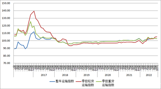 分车型指数看,各车型指数环比涨跌互现,同比去年继续保持小幅增长。以大宗商品及区域运输为主的整车指数为102.8点,比上月回落0.22%,比上年同期增长2%。零担指数中,零担轻货指数为105.3点,比上月回升0.21%,比上年同期增长7.3%;零担重货指数为102.8点,比上月回落0.26%,比上年同期增长2.1%。
