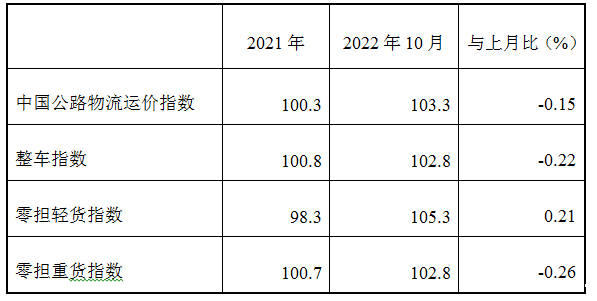 2022年10月份,由中国物流与采购联合会和林安物流集团联合调查的中国公路物流运价指数为103.3点,比上月回落0.15%,比去年同期增长3%。从周指数看,第一、三周运价指数环比回落,第二、四周运价指数环比回升。