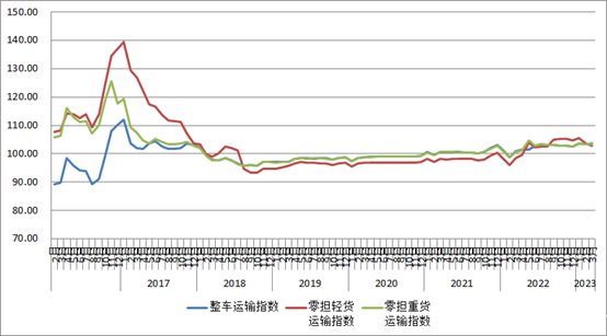 分车型指数看,各车型指数环比涨跌互现,同比去年保持增长。以大宗商品及区域运输为主的整车指数为103.5点,比上月回升0.19%,比上年同期增长2.7%。零担指数中,零担轻货指数为102.9点,比上月回落0.87%,比上年同期增长4.6%;零担重货指数为103.5点,比上月回升0.24%,比上年同期增长2.9%。