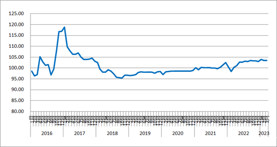 2023年3月份,由中国物流与采购联合会和林安物流集团联合调查的中国公路物流运价指数为103.4点,与上周基本持平,比去年同期增长3.1%。从周指数看,第一、二周运价指数环比回升,第三周运价指数环比回落,第四、五周运价指数总体平稳。