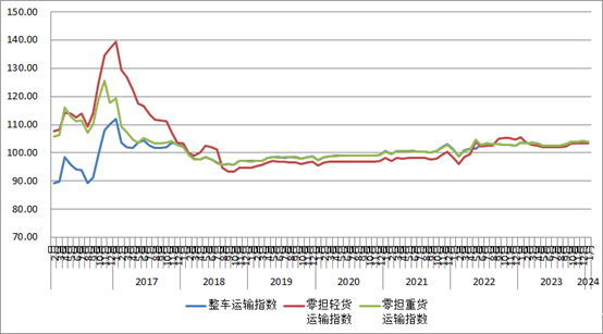分车型指数看,各车型指数环比涨跌互现,同比去年走势分化。以大宗商品及区域运输为主的整车指数为104点,比上月回落0.11%,比上年同期回升0.35%。零担指数中,零担轻货指数为103.4点,比上月回升0.05%,比上年同期回落2%;零担重货指数为103.9点,比上月回落0.15%,比上年同期回升0.38%。