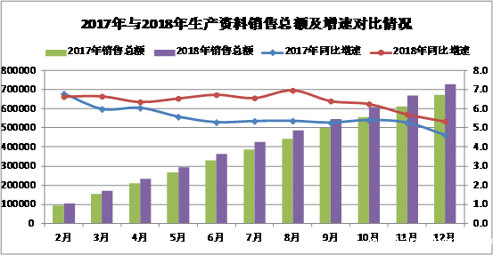 2018年,经济增速稳中趋缓,上半年相对较好,但下半年稳中有变的态势较为明显。进入下半年后,PMI连续下降,9月份回落至51%以下,12月降至49.4%,自2016年8月份以来首次回落到50%以下。在此背景下,大宗商品市场销售规模增速也有明显下滑。据初步估算,2018年全年,大宗商品销售总额达到72.8万亿元,可比价同比增长4.6%,增速较上年同期下降0.7个百分点。从全年走势来看,四个季度平均增速分别为5.1%、4.3%、4.5%和1.5%,呈明显下行趋势。