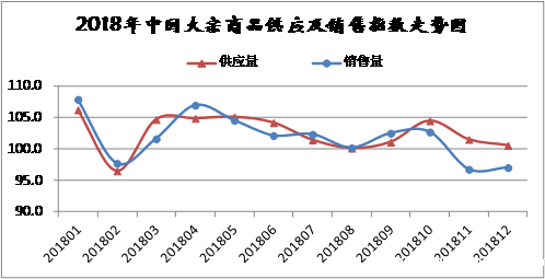 2018年,我国大宗商品市场供需格局大体呈现两个阶段。前三季度,受经济运行整体稳健,结构优化,新动能加快成长等因素影响,大宗商品市场供需两旺,整体趋于均衡,大宗商品供应指数和销售指数除2月份以外,其余月份均呈现上升走势。四季度,经济运行下行压力增大、天气转冷以及环保限产全面推进,给供需两侧均带来影响,特别是淡季来临令市场需求缩减更加明显,市场供需走势开始分化,供应量继续增加,虽然指数有所回落,但只是增速有所放缓,而商品销售量有明显下滑,销售指数跌至近十九个月以来的最低,前三季度建立的供需相对均衡的局面被打破,市场供大于求的迹象开始显现。从大宗商品指数走势来看,供应指数全年平均水平为102.6%,销售指数全年平均水平为101.9%,供应指数高于销售指数0.7个百分点。
