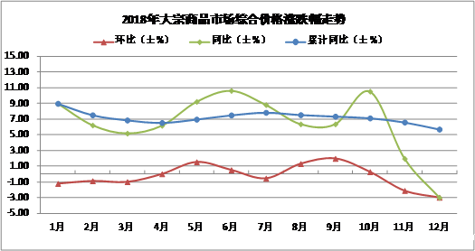 2018年,大宗商品市场价格整体呈现先逐步回升,后冲高回落的走势。前三季度,在供需关系持续改善的情况下,大宗商品市场价格呈现逐步回升的态势。四季度,市场需求低迷,供给持续增加,叠加资金紧张因素,价格转头向下。整体来看,与2017年相比,市场平均价格仍有小幅上涨。2018年全年,大宗商品累计平均价格较上年同期上涨5.7%,较年初上涨0.1%。