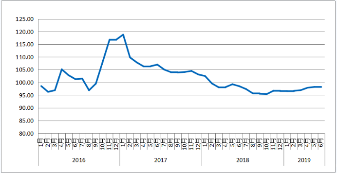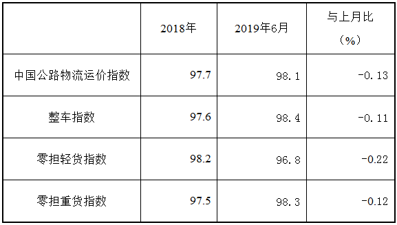 2019年6月份,由中国物流与采购联合会和林安物流集团联合调查的中国公路物流运价指数为98.1点,环比回落0.13%。月内各周指数趋于稳定,波动幅度较小,各周指数均保持在980点至981点之间。