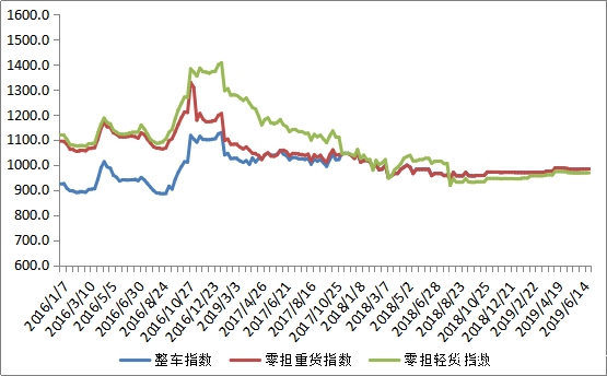 分车型看,各车型指数涨跌互现。其中,整车指数为982.81点;比上周回落0.12%;零担重货指数为984.11点,比上周回升0.05%;零担轻货指数为968.68点,比上周回升0.03%。