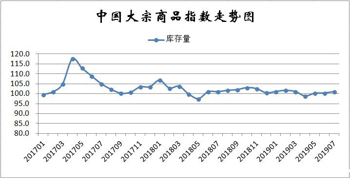 2019年7月份,大宗商品库存指数连续三个月回升,至101.0%,显示随着终端需求持续转弱,商品库存出现明显积压,库存压力仍在加大。各主要商品中,除原煤和成品油库存有所下降外,其余品种均呈现不同程度的上升。