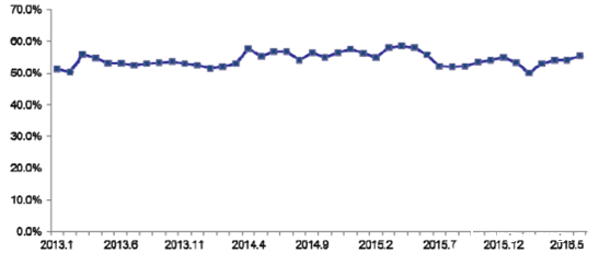 2013年以来中国物流业景气指数走势图