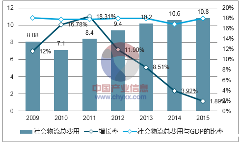 得益于现代物流的快速与专业化程度的不断提升,我国社会物流效率逐步提高。国际上普遍以全社会物流总费用占 GDP 的比例来评价整个经济体的物流效率,社会物流总费用占 GDP 的比例越低,代表该经济体物流效率越高,物流产业越发达。2009-2015 年,全国社会物流总费用与 GDP 的比率由 18.1%下降至 16.00%,物流效率整体上呈现出提高态势。但与发达国家物流总费用占 GDP的比例约 10%相比,我国物流成本仍处于较高水平,降低了生产企业产品的竞争力,影响了国民经济的运行效率,未来仍有较大的进步空间。