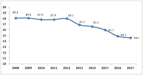 图1:2008-2017年社会物流总费用与GDP的比率(单位:%)