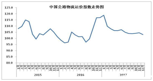 一是公路物流价格总体平稳,较上年略有回升。2017年,公路物流市场需求增势稳定,运力更新升级不断加快,价格总体小幅回升。中国公路物流价格指数年平均为106.5点,比2016年均值回升3%。其中上半年指数延续了2016年三、四季度冲高后的回升走势,下半年则有所趋缓。