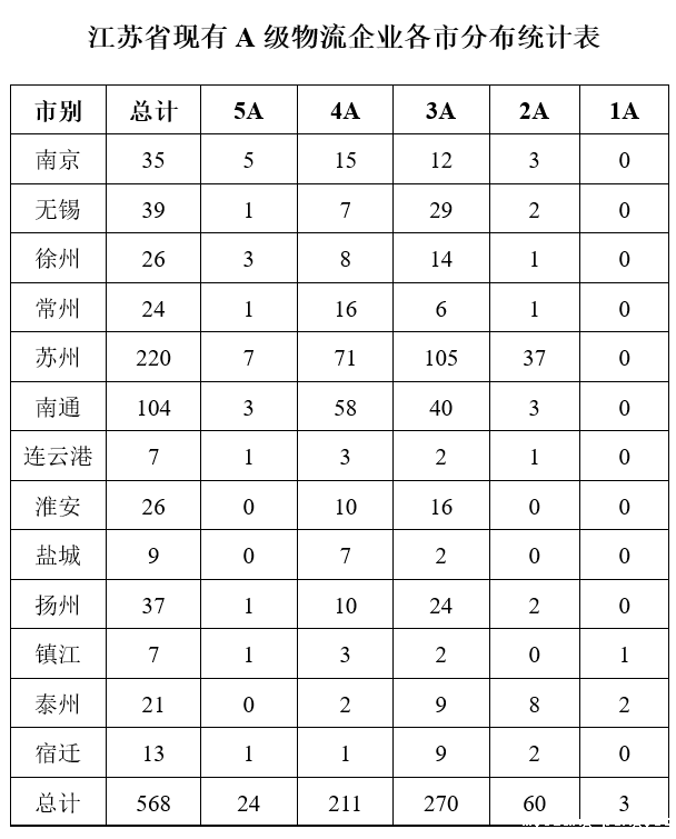 日前,我省拥有A级物流企业情况:5A级物流企业24家,4A级物流企业211家,3A级物流企业270家,2A级物流企业60家,1A级物流企业3家。