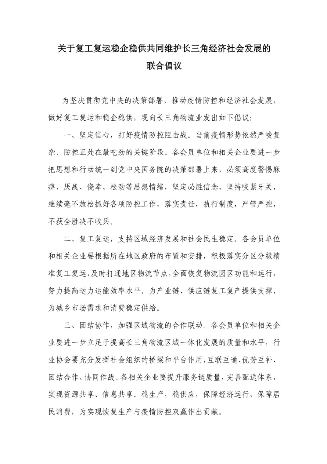 关于复工复运稳企稳供共同维护长三角经济社会发展的联合倡议