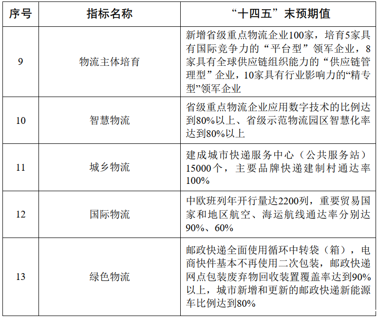 智慧绿色发展增添新动力。5G、大数据中心、人工智能等新型基础设施在物流领域的覆盖率大幅提升,物联网、大数据、区块链等技术和智能装备在物流领域广泛应用。省级重点物流企业应用数字技术的比例达到80%以上、省级示范物流园区智慧化率达到80%以上。物流绿色化水平明显提升,逆向物流体系基本建成,邮政快递全面使用循环中转袋(箱),电商快件基本不再使用二次包装,邮政快递网点包装废弃物回收装置覆盖率达到90%以上,城市新增和更新的邮政快递新能源车比例达到80%。
