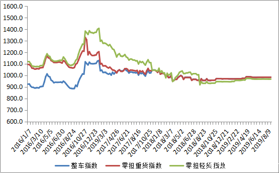 分车型看,整车指数和零担重货指数与上周基本持平,零担轻货指数小幅回落是运价指数的主要原因。其中,整车指数为984.22点,零担重货指数为983.92点,均与上周持平;零担轻货指数为966.37点,比上周回落0.19%。