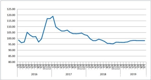 2019年9月份,由中国物流与采购联合会和林安物流集团联合调查的中国公路物流运价指数为98点,与上月相比小幅回落0.03%,但比去年同期增长2.6%。月内各周指数运行平稳,其中第一、四周运价指数环比回落,第二、三周环比回升。